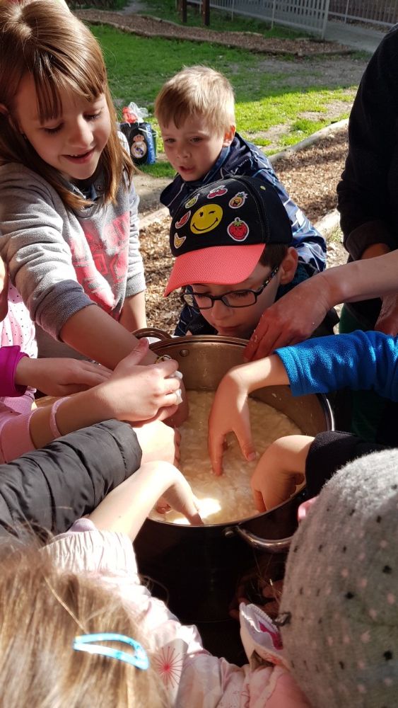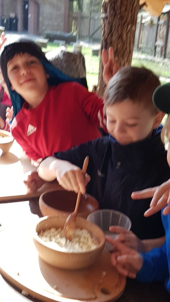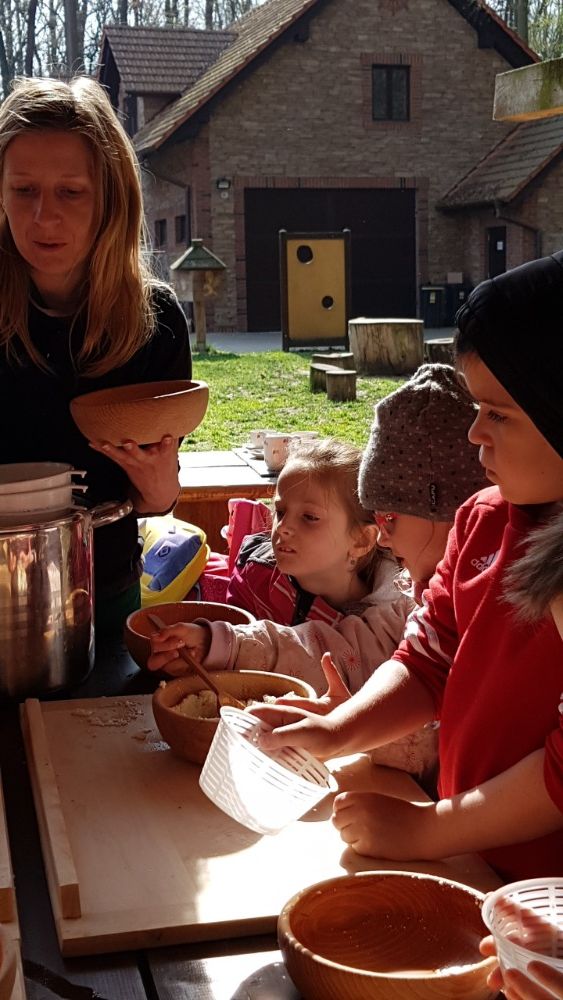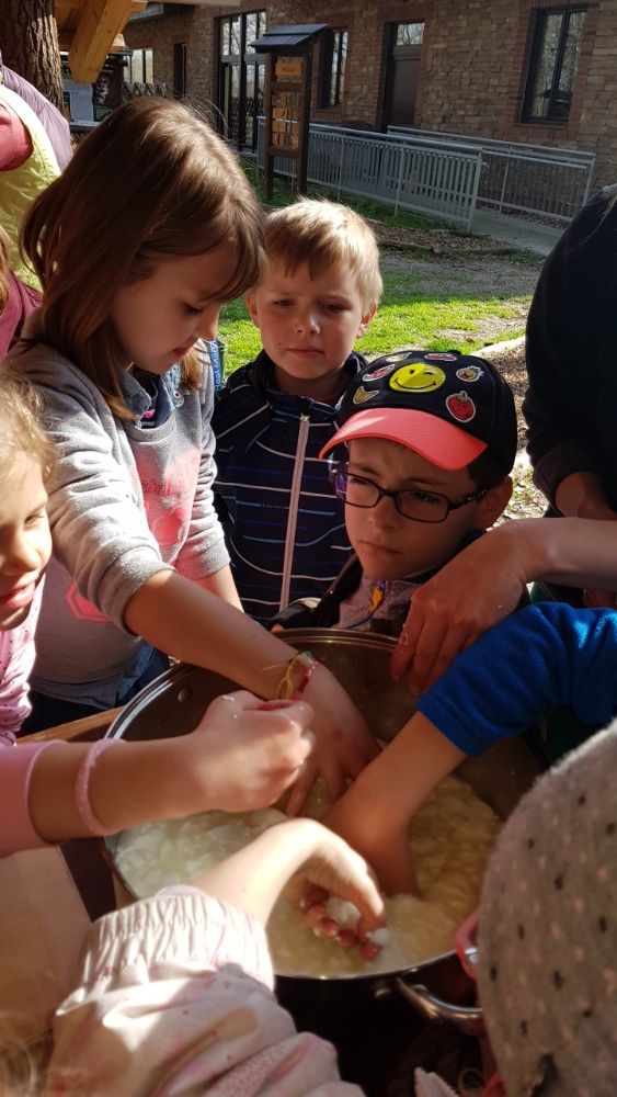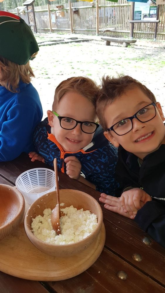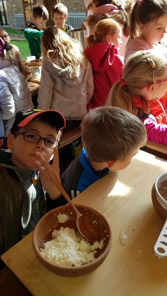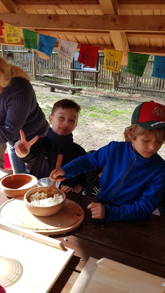 Po prohlídce voliér následoval proces výroby sýru z mléka, kdy jsme si ve dvojicích vyrobili svůj malý bochníček sýra, který jsme si vzali domů.