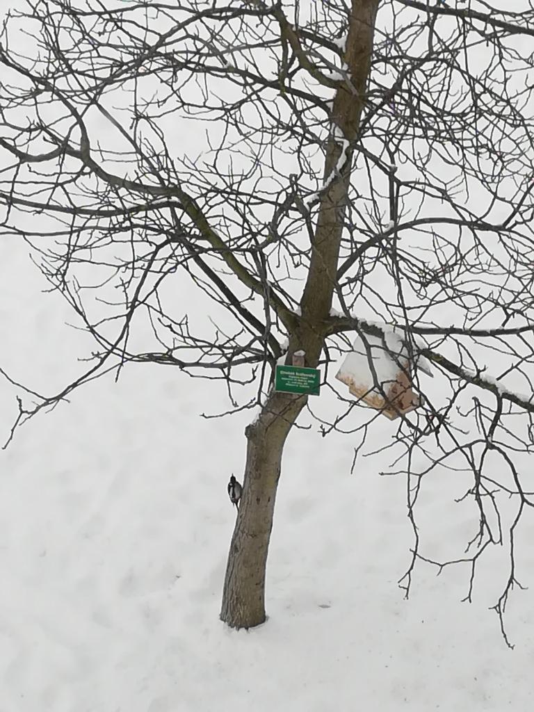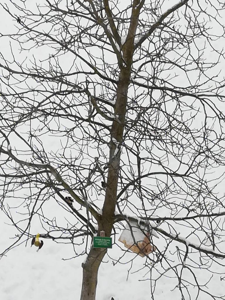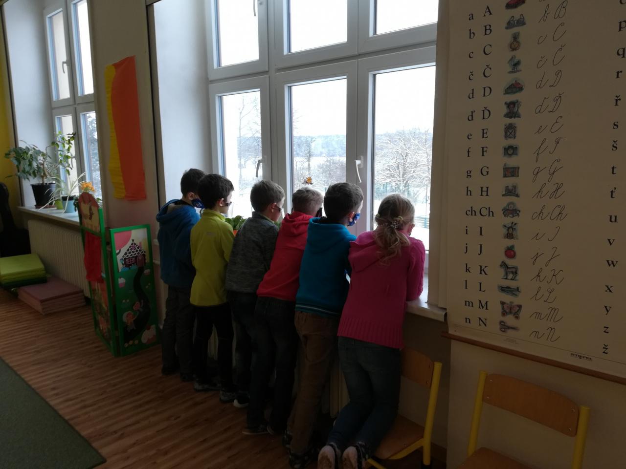 V únoru jsme se v rámci programu Les ve škole věnovali péči o ptáčky . Na okno ve třídě a na strom pod okny jsme umístili 2 krmítka darovaná od rodičů a do nich nasypali ptačí zob. Protože venku pěkně mrzlo, tak jsme ptáčkům na větve rozvěsili ještě lojové koule. A opravdu se bylo na co dívat. Přiletěly nejen sýkorky, kosi a vrabci, ale i pěnkavy a dokonce jsme přilákali na lojové koule i pár strakapoudů. Na fotografiích je vidět jak jinak opuštěný ořešák rázem ožil a kdo se procházel přímo před námi na okenní římse.
