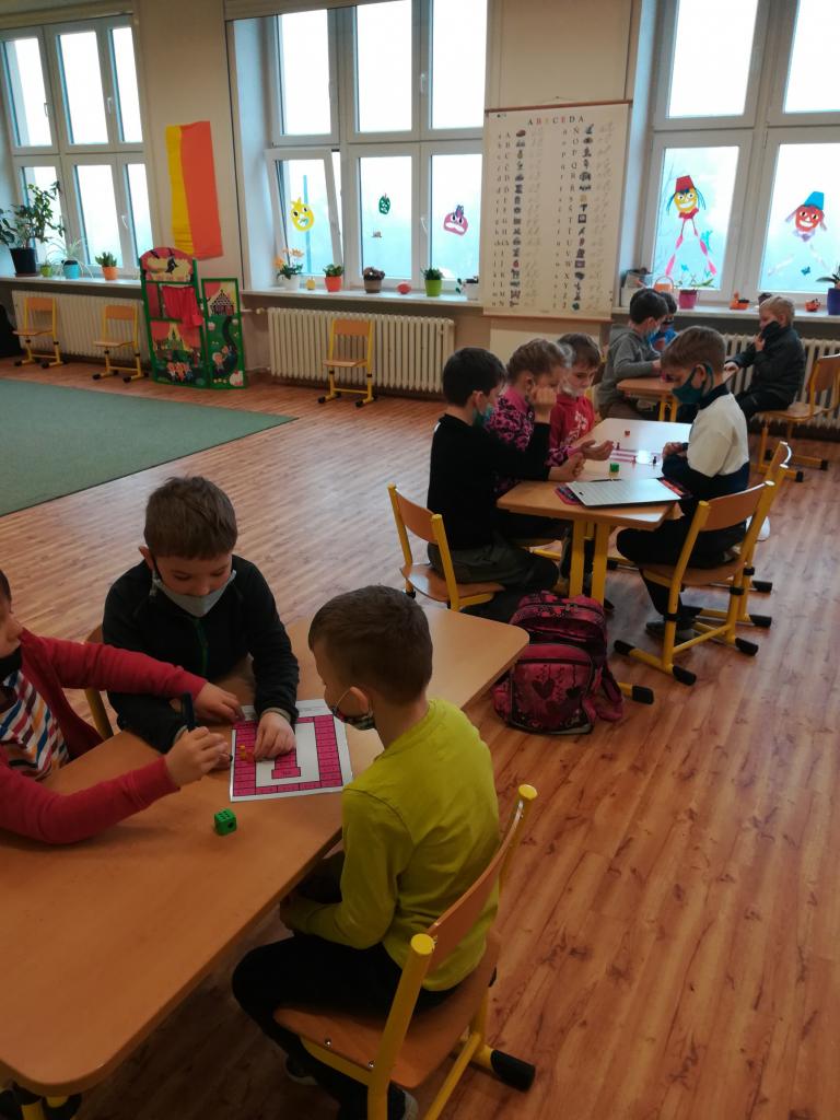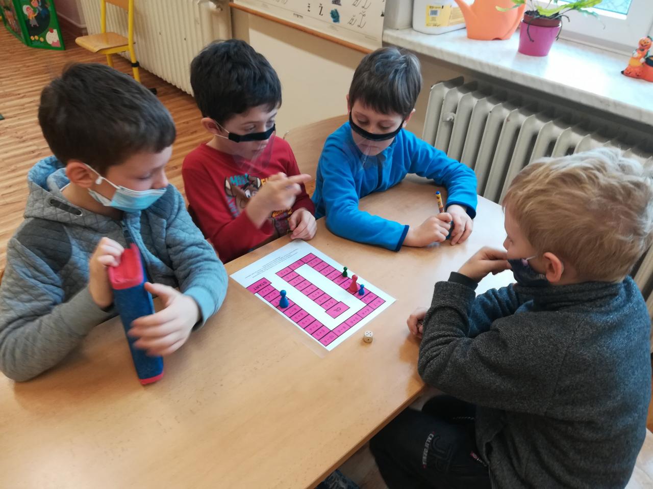 Matematiku jsme si procvičovali s figurkami na herních kartách i s házením kostek na koberci.