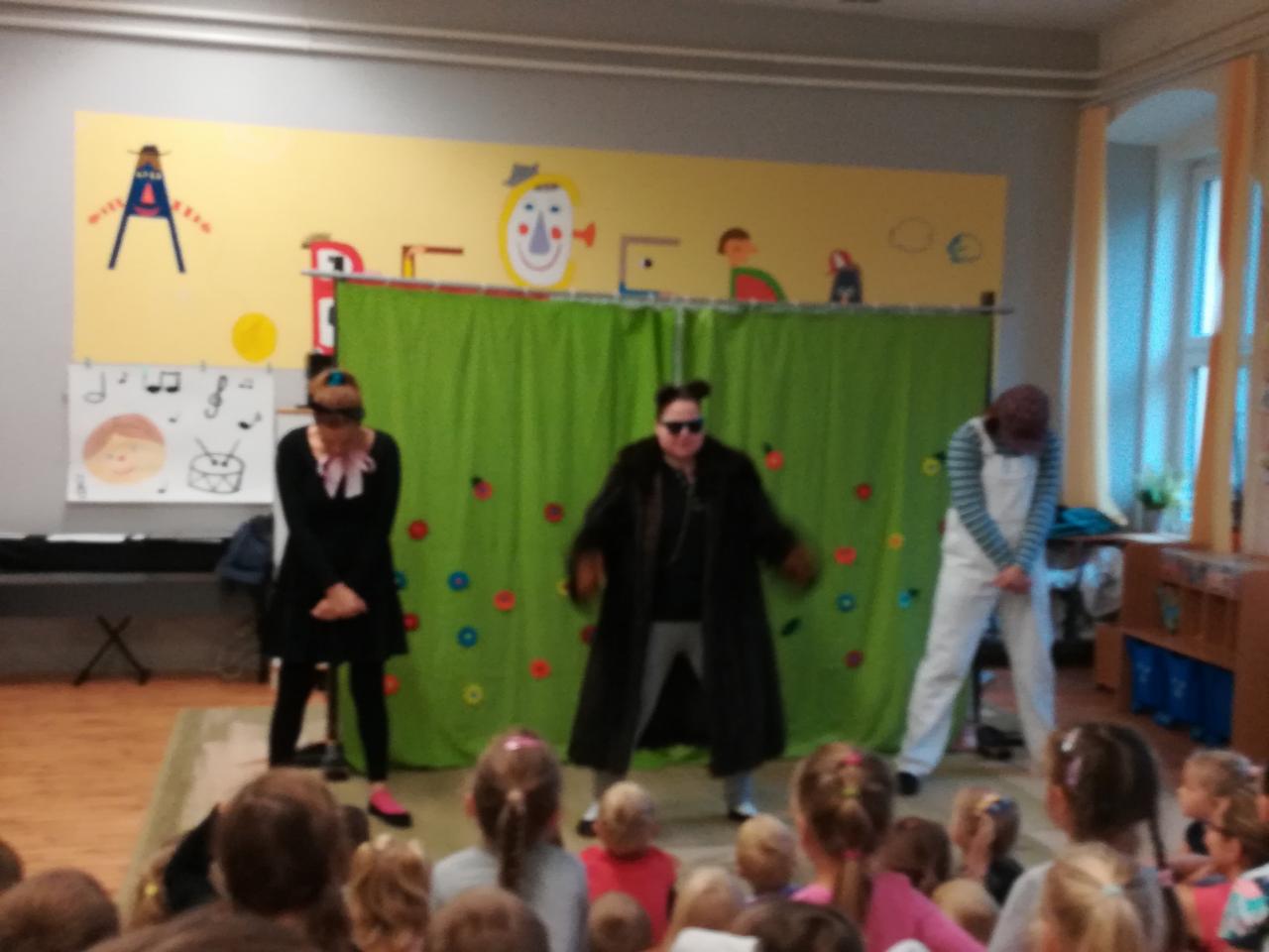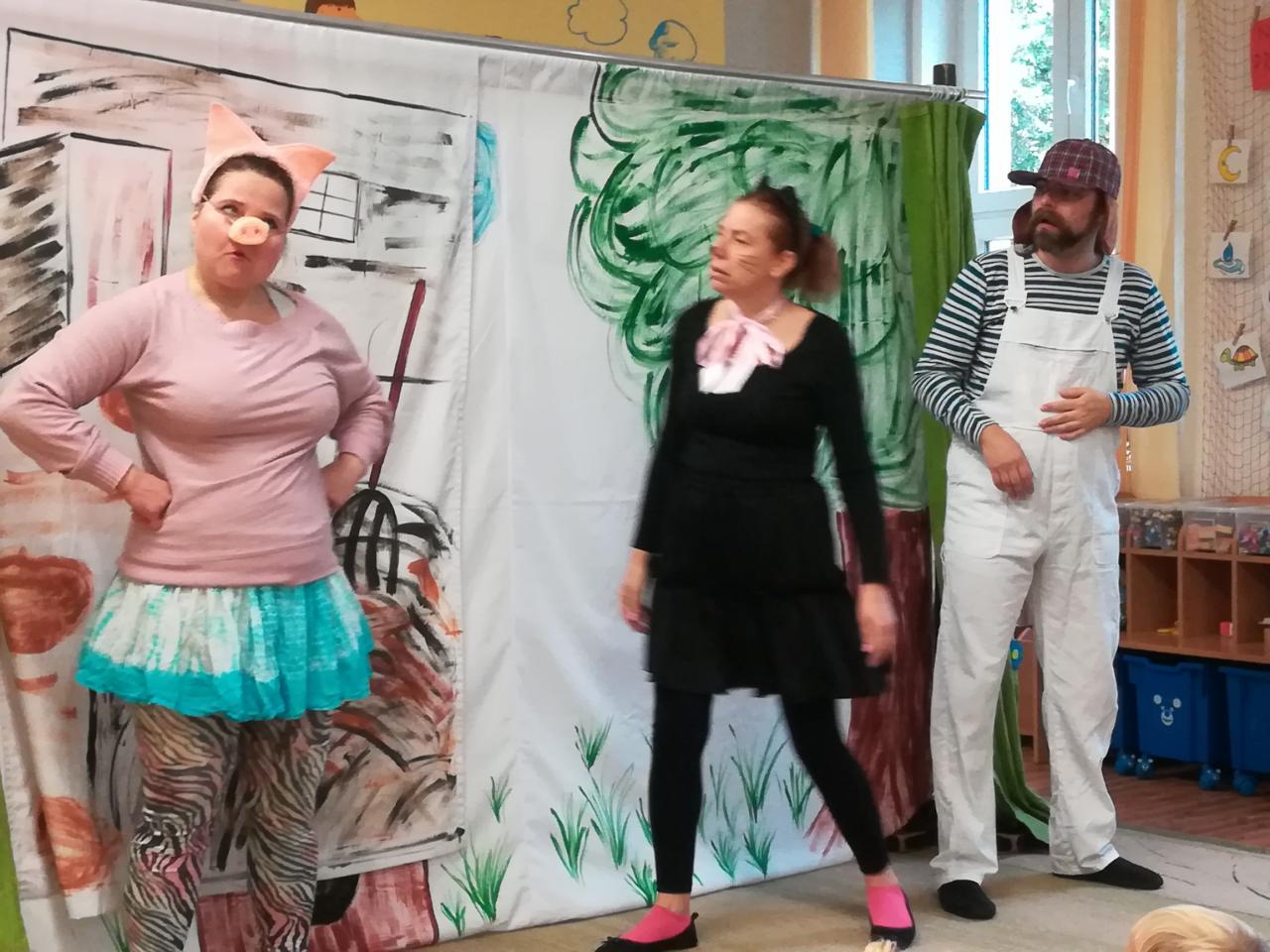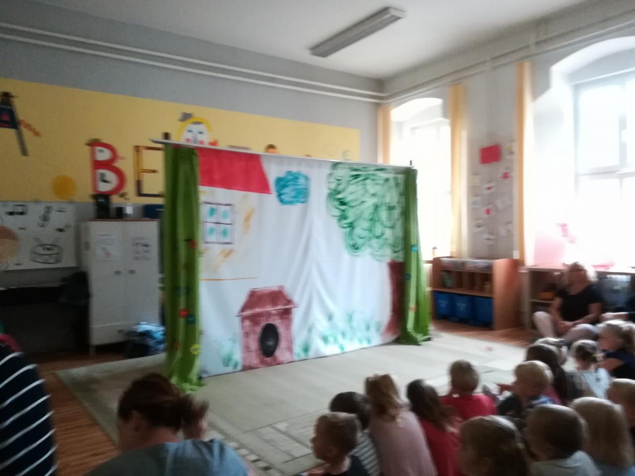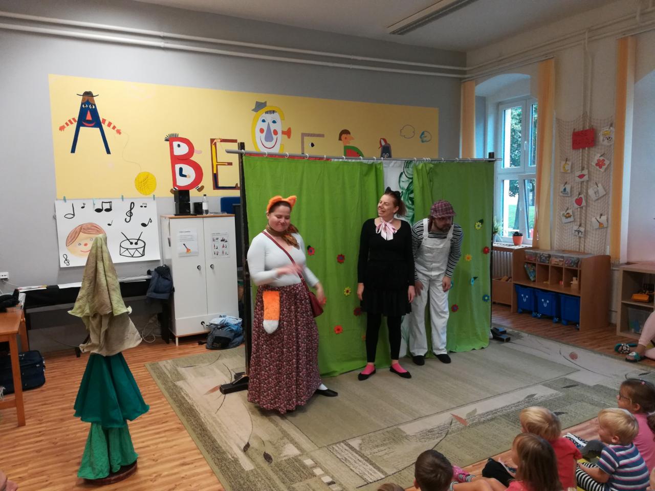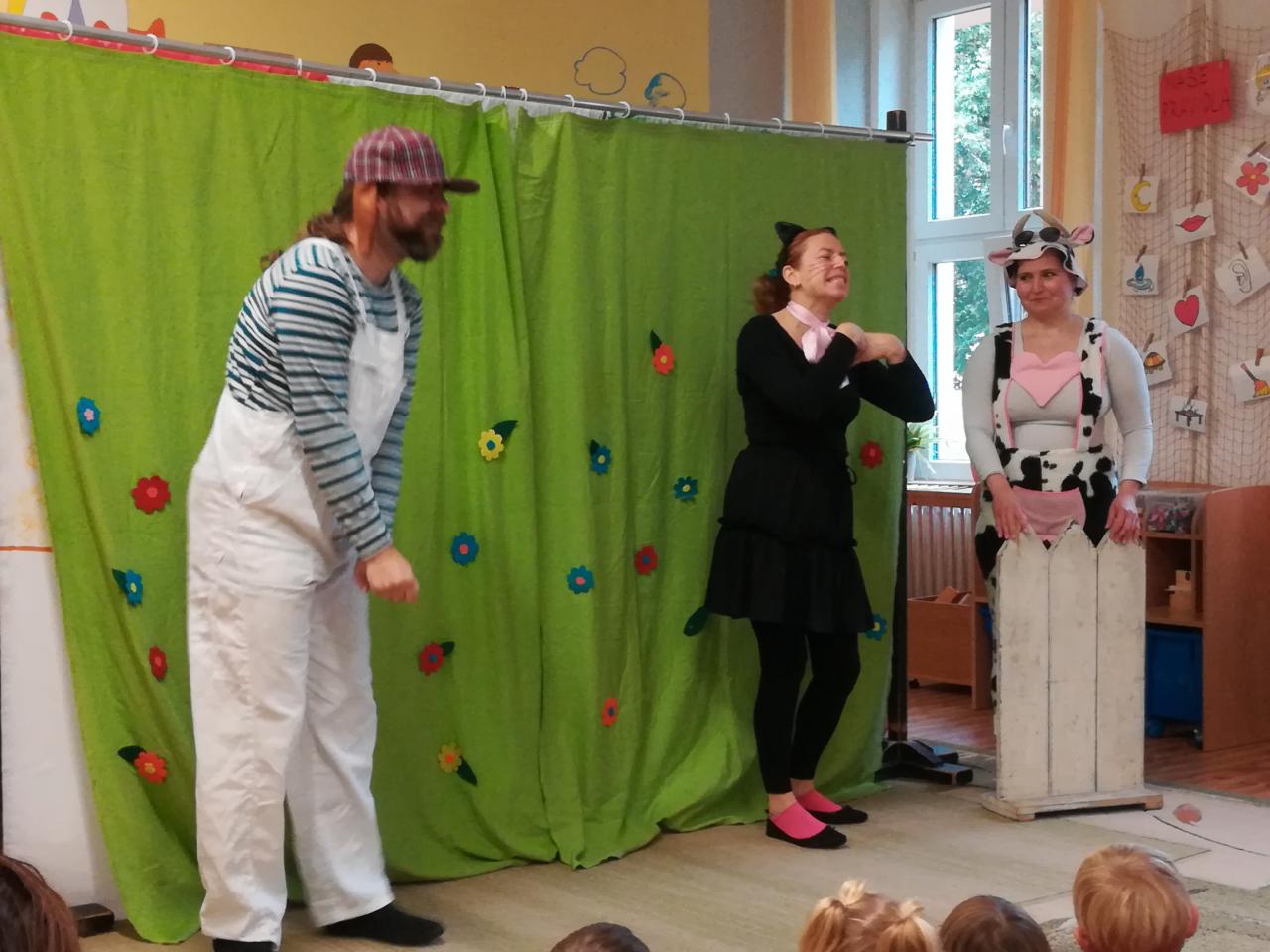 Ve čtvrtek 15.9. přijelo do MŠ divadélko s představením Pac a Mňau , kterého jsme se s 1. třídou zúčastnili. Pohádka byla vtipná, plná písniček a veselých scének. Pejsek s kočičkou se vypravili do světa, aby se seznámili se zvířátky na dvoře a v lese. Cestou potkali kohouta, vepříka, kravičku, v lese potom jezevce, medvěda a lišku. Hodně nás pobavily veselé kostýmy a vtipné taneční kreace.