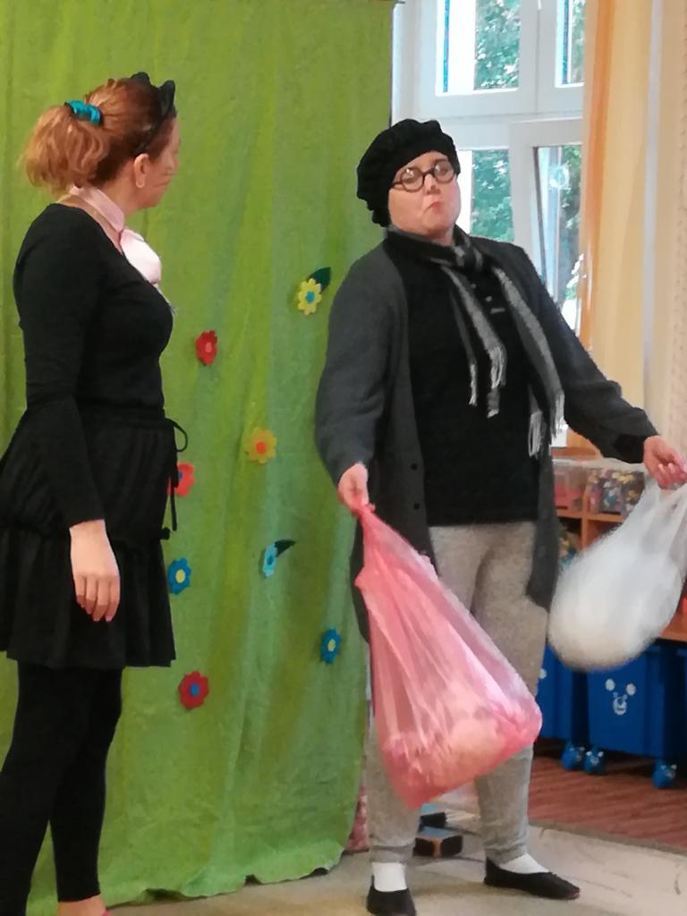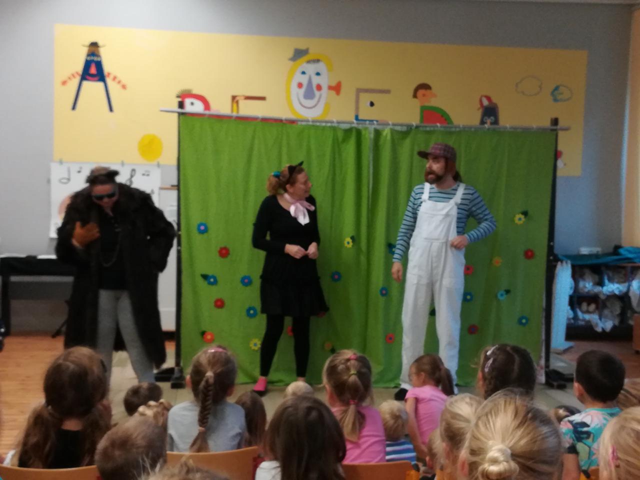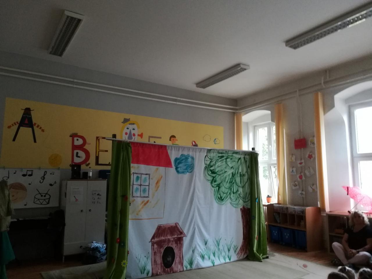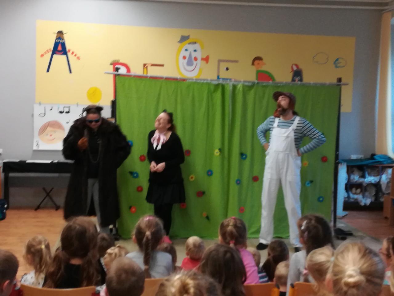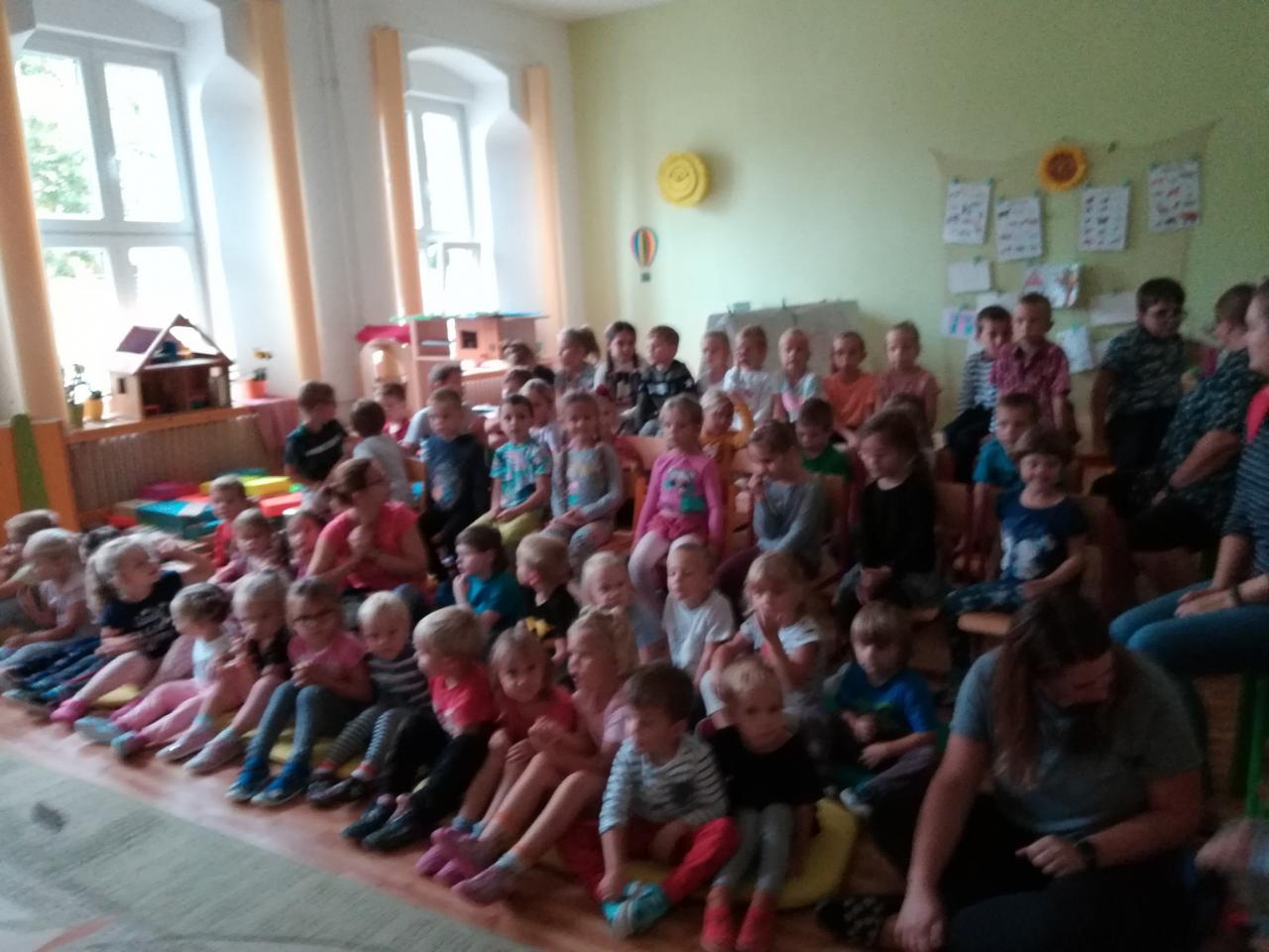 Ve čtvrtek 15.9. přijelo do MŠ divadélko s představením Pac a Mňau , kterého jsme se s 1. třídou zúčastnili. Pohádka byla vtipná, plná písniček a veselých scének. Pejsek s kočičkou se vypravili do světa, aby se seznámili se zvířátky na dvoře a v lese. Cestou potkali kohouta, vepříka, kravičku, v lese potom jezevce, medvěda a lišku. Hodně nás pobavily veselé kostýmy a vtipné taneční kreace.