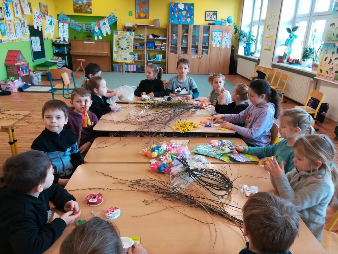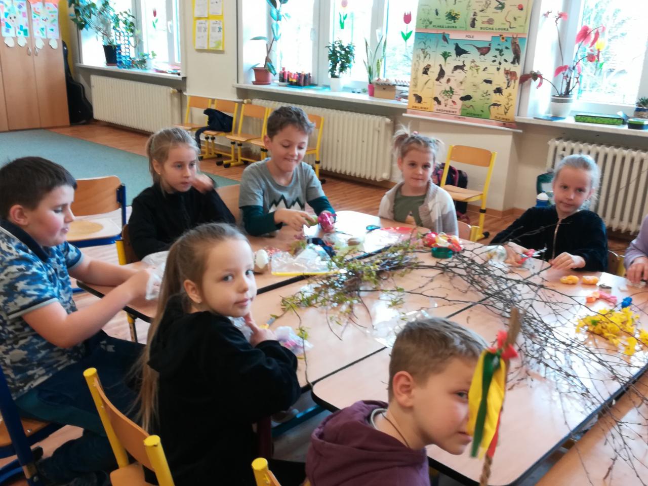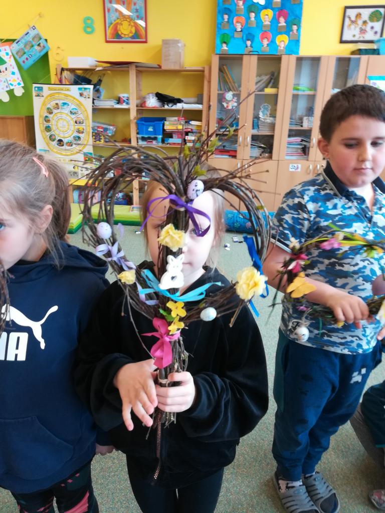 Velikonoční týden jsme zahájili Modrým pondělím a vyprávěním o velikonočních tradicích. Každý den velikonočního týdne až do středy jsme se připravovali na oslavu přicházejících svátků , nacvičovali básničky na velikonoční pomlázku a také jsme tvořili velikonoční výzdobu z březových proutků, kterou si žáci odnesli s sebou domů. Zbývajícími proutky jsme vyzdobili plot před naší školou. A těšili jsme se na nadcházející sváteční dny a na pomlázku.