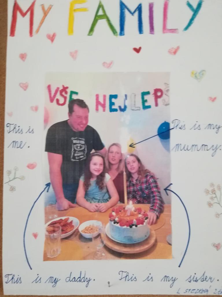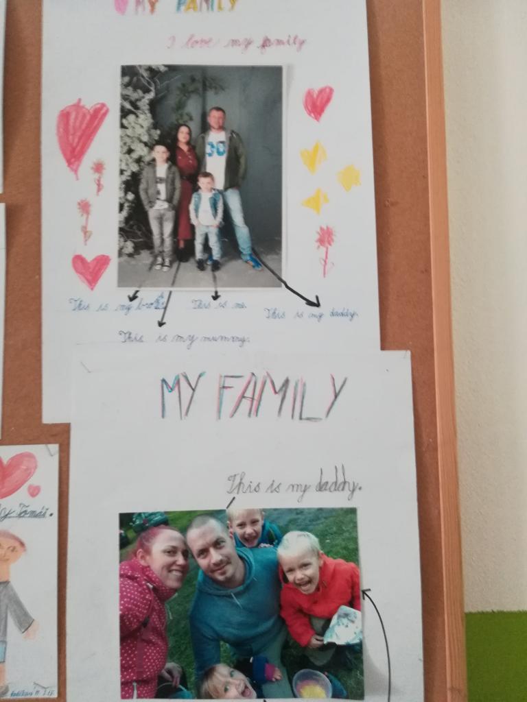 V září jsme se ve 2. třídě opět setkali na prvních hodinách angličtiny, a protože již umíme psát, tak jsme si vyzkoušeli , jestli zvládneme anglicky napsat jednoduché věty o rodině. Přinesli jsme si rodinné fotografie a vytvořili jsme k nim jednoduché popisky. Naše práce jsme úspěšně vystavili na nástěnce v přízemí.